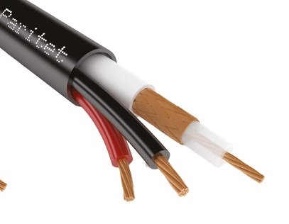 Кабель с коаксиальным (рк75-2-13м) проводником и 2 жилами для питания с внешней полиэтиленовой изоляцией, D-внешний = 7,2 мм, сечение жил = 0,75 кв. мм (для внешней прокладки)