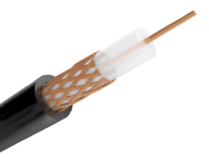 Кабель коаксиальный однопроволочный с поливинилхлоридной изоляцией, D-внешний = 6,55 мм, R = 75 Ом, черный, внутренний проводник медь 0,75 мм, внешний проводник медь 90% (для внешней прокладки).