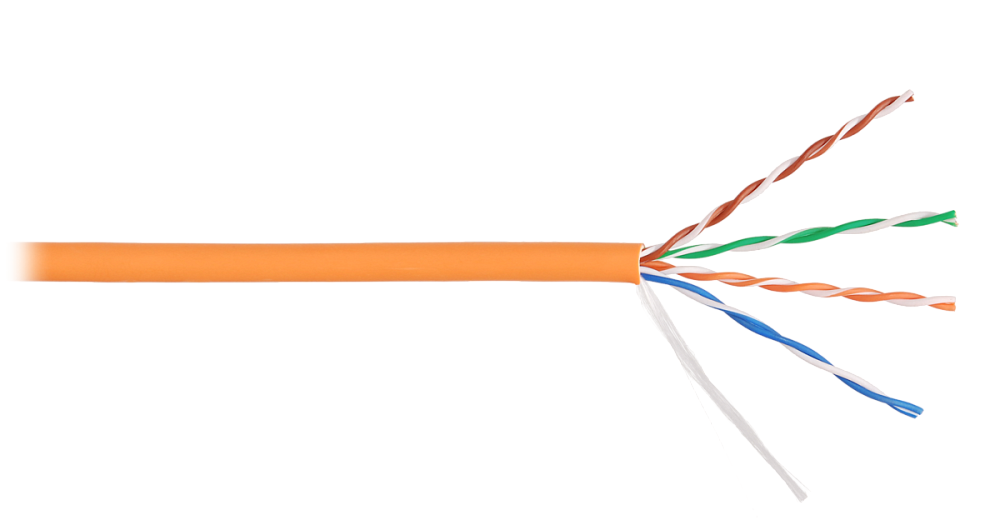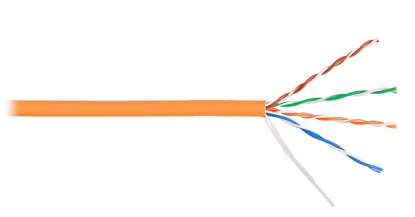 Кабель медный U/UTP, cat 5e, 4х2х0.51, для внутренней прокладки, оболочка LSZH нг(А)-HFLTx, цвет оранжевый, внешний диаметр 5,2 мм, диапазон рабочих температур -20...+60°С, температура монтажа не ниже -0°С.