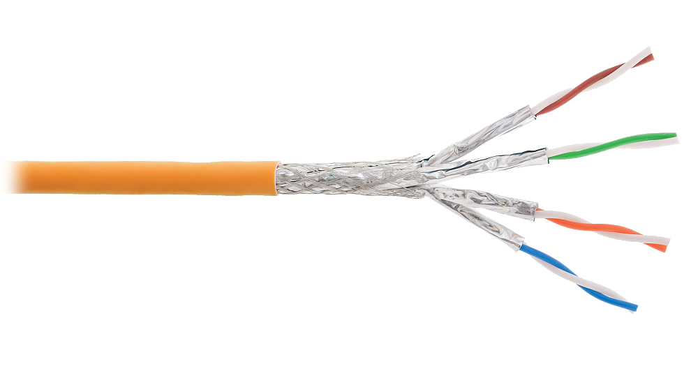 Кабель витая пара S/FTP, Кат 6е, 4х2х0.55, экранированный для внутренней прокладки, оболочка LSZH нг(А)-HFLTx, цвет оранжевый, внешний диаметр 7.4 мм, температура монтажа не ниже -0°С, диапазон рабочих температур -20...+75°С.