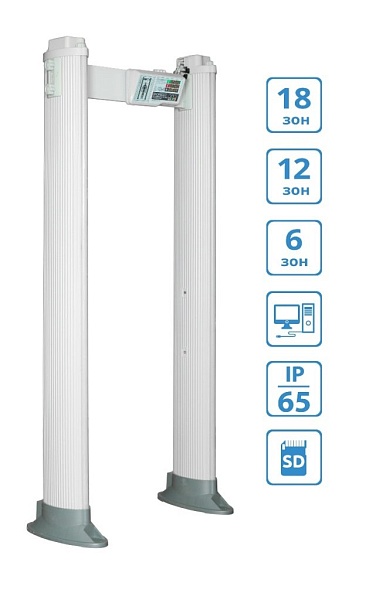 18/12/6-зонный арочный металлодетектор. Сверхпрочный с уровнем пылевлагозащиты IP-65. Оснащен новейшей функцией - регистратором событий с SD-card. Наличие «сухих контактов», а также три способа подключения к сети (справа, слева, сверху).Безвредны для человека, 2230х1130х300 мм.