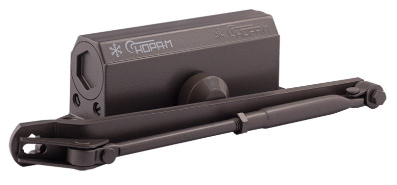 Доводчик с фиксацией: при распахивании двери на 90 и более градусов, механизм удерживает полотно двери открытым.
