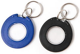 Брелок Mifare 1K, синий с прозрачной серединой, с металлическим кольцом.