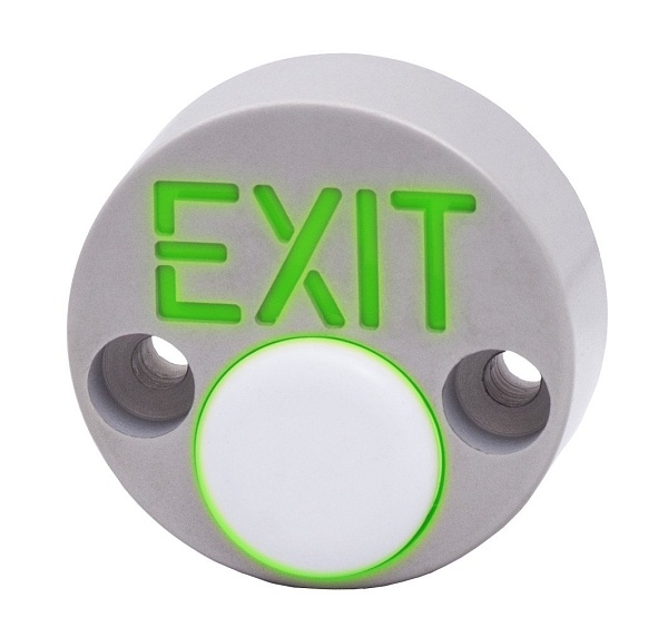 Кнопка накладная, контакты нормально разомкнутые (НР), материал: анодированный алюминиевый сплав. Светодиодная подсветка контура кнопки и надписи "EXIT" зеленого цвета, U-подсв. 12 В, U-комм. 36 В, I-комм. 2 А, габ.размеры Ø39x17 мм.