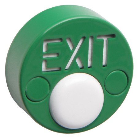 Кнопка накладная, контакты нормально разомкнутые (НР), материал: анодированный алюминиевый сплав. Светодиодная подсветка контура кнопки и надписи "EXIT" зеленого цвета, U-подсв. 12 В, U-комм. 36 В, I-комм. 2 А, габ.размеры Ø39x17 мм.