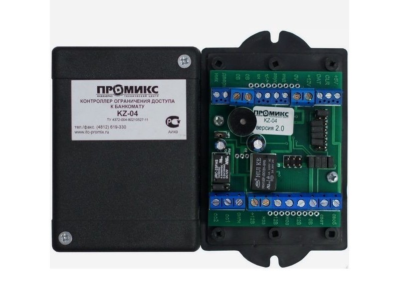 Promix-CS.PD.01 Контроллер ограничения доступа к банкомату (KZ-04). Позволяет подключать: считыватель банковских карт, электроуправляемый замок/защелку, датчик открытия двери, датчик присутствия клиента, светодиодную мнемосхему «занято-свободно», блок управления дополнительными устройствами (освещение и видеозапись), блок речевого оповещения, шлейф охранной сигнализации, систему оповещения о пожаре, местные средства тревожного оповещения, переключатель «свободный доступ - управляемый доступ». Все настройки делаются перемычками! Работает с картами МИР.