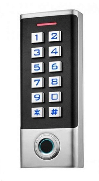 Кодонаборная панель с биометрическим считывателем отпечатков пальцев и считывателем карт EM-Marin, память 10 000 карт и 600 отпечатков, подключение дополнительного считывателя по интерфейсу Weigand 26, корпус - металл+пластик, пылевлагозащищенный, DC 12-24 В, IP68, -40...+60 °С, 152х60х24 мм
