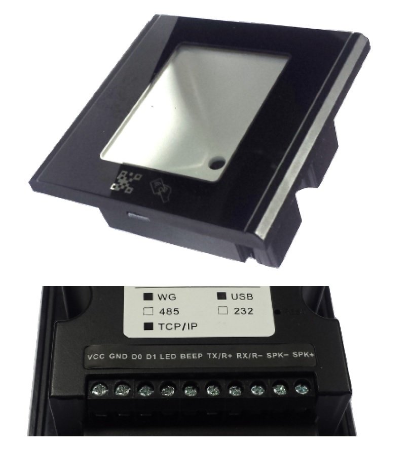 Считыватель QR кодов и идентификаторов Mifare. Дальность считывания карт 1-3 см. Интерфейсы Wiegand 26 (34), USB. DC 12-15В, 800 мА, -20...+70 °С, 86х86х42 мм