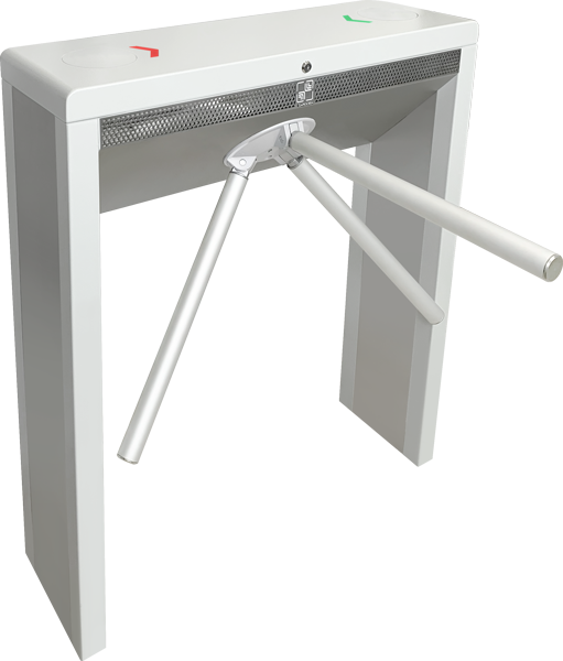 Электромеханический турникет-трипод в тумбовом корпусе, с автоматической системой «Антипаника», окрашенная сталь, световая индикация, ширина прохода 550 мм, 12 В, 3 А, IP41, +1…+45 °С, 756х890х1054 мм, 45 кг. БЕЗ преграждающих планок