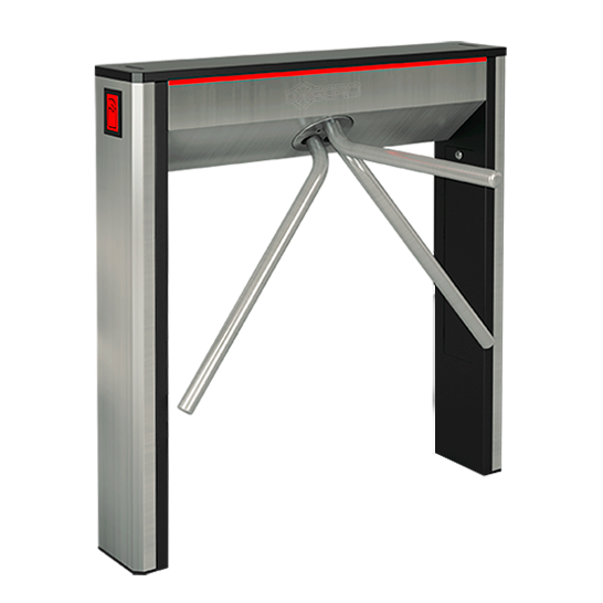 Электронная проходная. Турникет-трипод тумбовый, электромеханический. Контроллер ЭРА-2000. Два считывателя Mifare встроены в корпус со светодиодной подсветкой. В комплекте пульт, преграждающие планки. Механическая "антипаника". Крашенная сталь.