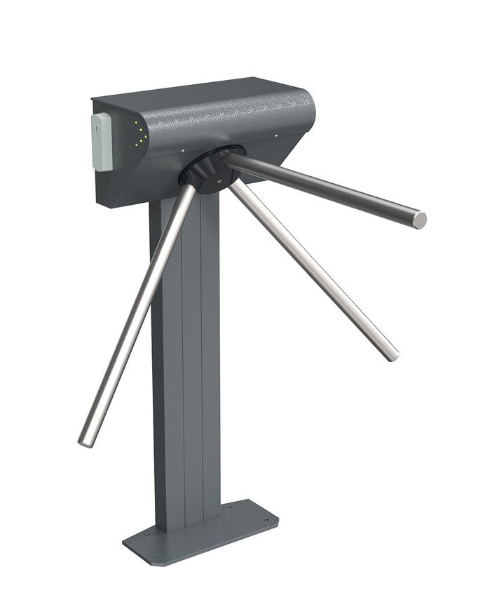Электромеханический турникет (трипод), со встроенным контроллером СКУД и двумя считывателями карт Mifare, память 7000 ключей/40 000 событий, подключение по сети Ethernet, ширина прохода 745 мм, 12 В/1,5 А, световая индикация, пульт управления. Без преграждающих планок. Бесплатное ПО на 1 точку прохода.