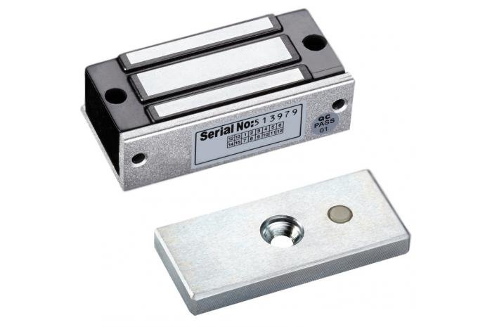 Миниатюрный электромагнитный замок c силой удержания до 60 кг; DC 12 В; 260мА, 80×39×24,5 мм; габариты ответной пластины 80×33×20 мм