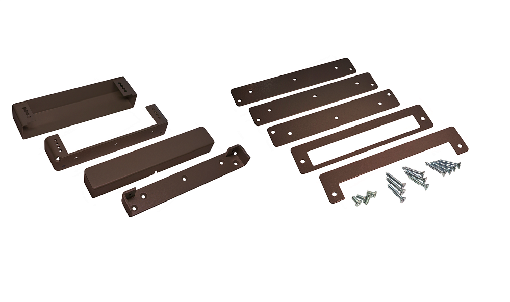 Монтажный комплект предназначен для крепления замка AL-250SM в накладном варианте установки. Комплект позволяет осуществить регулируемую установку кронштейна якоря замка на расстоянии от 0 до 23 мм от кронштейна корпуса замка. В комплекте: 2 кронштейна и 2 кожуха + элементы крепления. Цвет: коричневый.