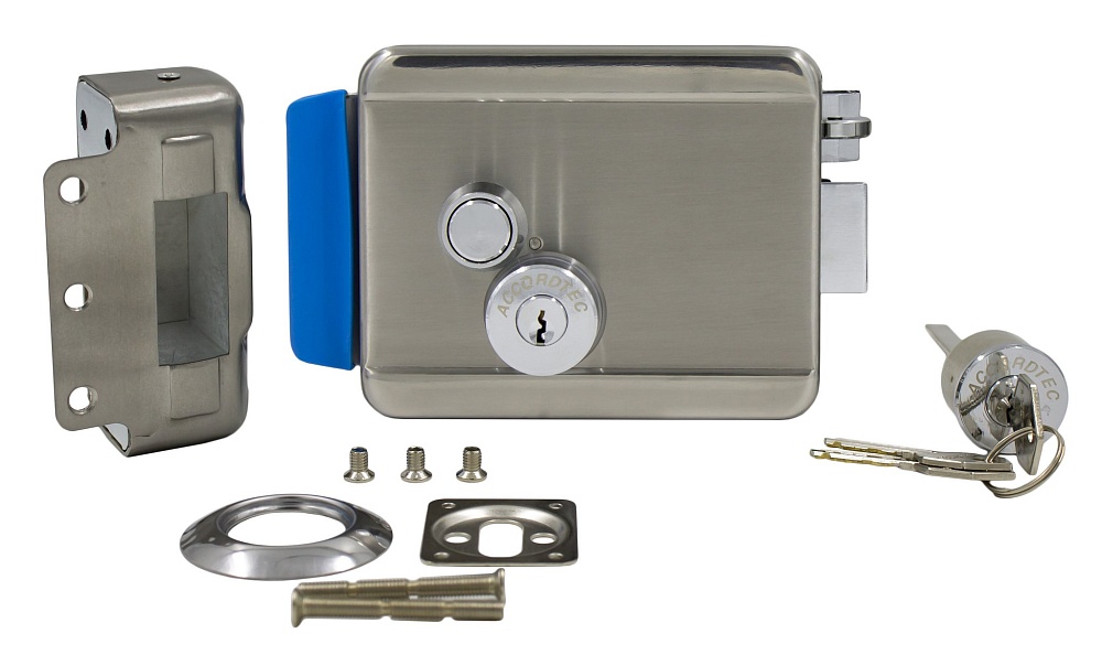 Электромеханический накладной замок, НЗ, универсальный, цилиндр снаружи, цилиндр и кнопка изнутри (с блокировкой) , 12 В, 3 А, -30...+50 °C, 120 х 102 х 35, нержавеющая сталь