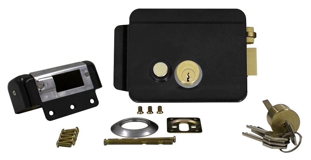Электромеханический накладной замок, НЗ, универсальный, цилиндр снаружи, цилиндр и кнопка изнутри, блокировка ключом в закрытом состоянии, сталь, цвет черный, 12 В, 3,5 А, 163х47х103 мм
