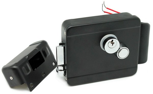 Замок накладной, электромеханический, универсальный (дверь наружу, внутрь), ролик взвода пружины, блокировка ключом кнопки выхода, цвет черный, 12В, 142х105х35мм.