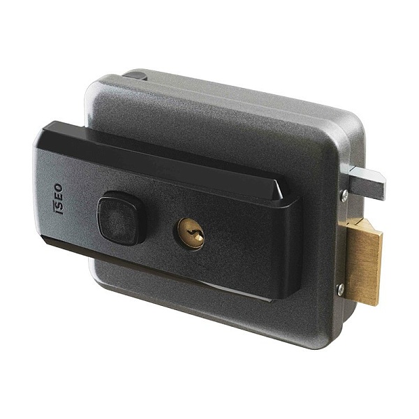 Замок электромеханический, накладной, с врезным цилиндром, для дверей открывающихся внутрь (право/лево), кнопка на выход с возможностью её блокировки, размеры: 106×130×62мм.
