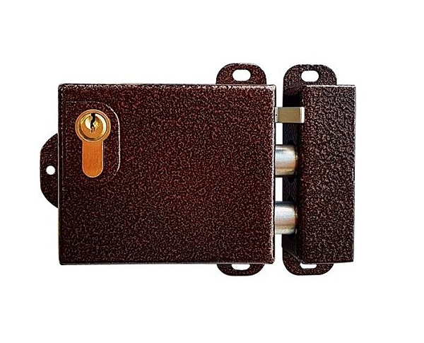 Электромеханический замок, накладной, на любую дверь, 12 В/0,6 А, снаружи и изнутри открывается ключом, диаметр засовов 18 мм, ход засовов 17 мм, размер 110х92х30 мм