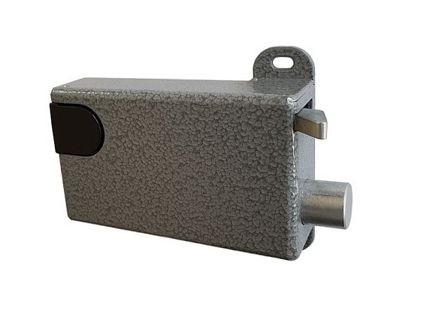 Накладной, на любую дверь, 12 В/0,8 А, кнопка выхода, снаружи открывается ключом, диаметр засова 18 мм, ход засова 16 мм, размер 110х64х30 мм