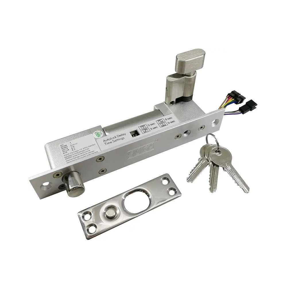 Врезной соленоидный электромеханический замок, нормально-закрытый, с личинкой (3 ключа), сила удержания 1200 кг, датчик положения двери НЗ, регулируемое время закрытия 0/3/5/9 сек., 12 В, 880 мA, 200х32,5 мм