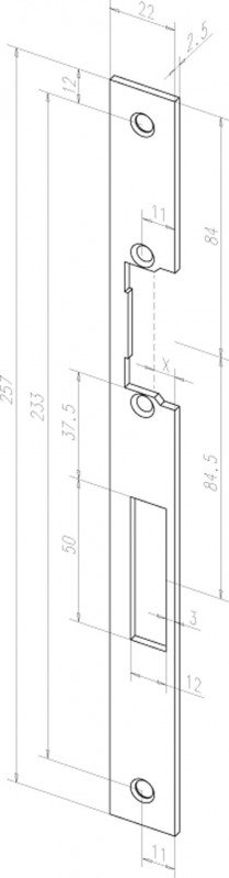 Плоская запорная планка с вырезами под язычок и ригель; универсальная; 257х22 мм; толщ. 2,5 мм; цинк