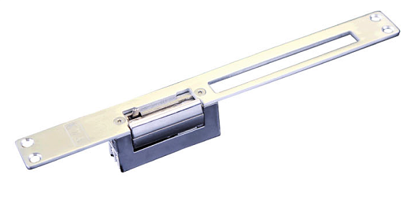 Нормально-закрытая электромеханическая защелка с рычажком механической разблокировки; DC 12В, 700 мА; длинная планка в комплекте; сталь; размеры 250×25×31 мм