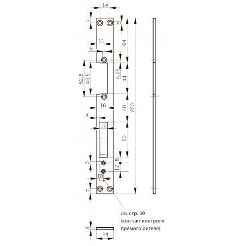 Планка плоская, нерж. сталь, подгот. для установ. конт. контр. вых. ригеля RK, для метал. дверей, отв. под язык и ригель, для серий Smoke, Basic-S , Basic, Fire.