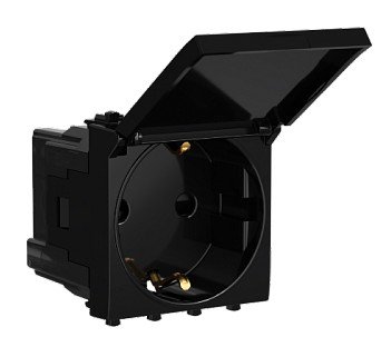 Розетка силовая с крышкой штекерная с заземлением со шторками серии Avanti, IP44, номинальное напряжение 250 В, номинальный ток 16 А, отверстия под кабель 3 мм, установочный размер 43х43 мм, цвет черный квадрат