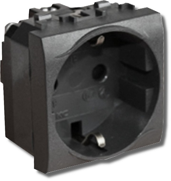 Силовая электрическая розетка серии "Brava", штекерная, с заземлением и со шторками, номинальное напряжение 250 В, номинальный ток 16 А, отверстия под кабель 3 мм, габаритные размеры 43х43 мм, цвет чёрный