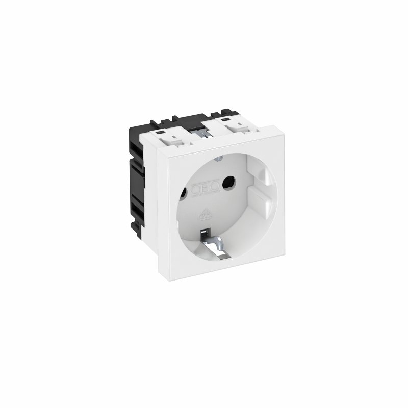 Розетка одинарная 2К+3 силовая, SCHUKO, для подключения вилки (штекера) под углом 0°, с автоматически закрывающимися защитными шторками, I-раб. 16 А, U-раб. 250 В, размер 45х45 мм - 1 модуль Modul45, белая