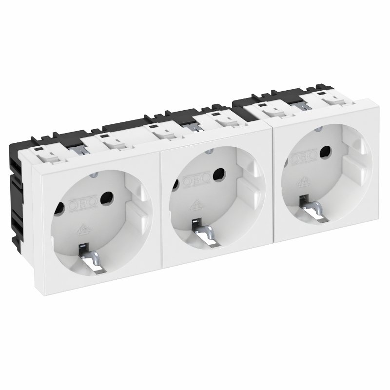 Розетка тройная 3х2К+3 силовая, SCHUKO, для подключения вилки (штекера) под углом 0°, с автоматически закрывающимися защитными шторками, I-раб. 16 А, U-раб. 250 В, размер 45х135 мм - 3 модуля Modul45, белая