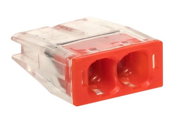 Клеммная колодка 2-х контактная с токопроводящей пастой Alu-Plus втычного типа для медных и алюминиевых одножильных проводов сечением 0,5 - 2,5 мм²; U-раб. 450 В, I-раб. 24 А; цвет красны
