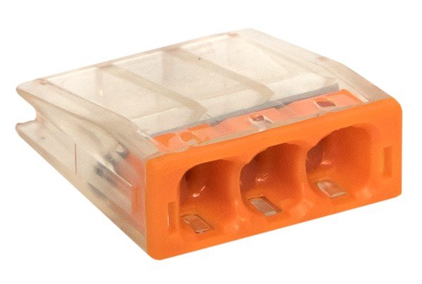 Клеммная колодка 3-х контактная с токопроводящей пастой Alu-Plus втычного типа для медных и алюминиевых одножильных проводов сечением 0,5 - 2,5 мм²; U-раб. 450 В, I-раб. 24 А; цвет оранжевый