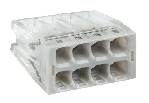 Клеммная колодка 8-ми контактная с токопроводящей пастой Alu-Plus втычного типа для медных и алюминиевых одножильных проводов сечением 0,5 - 2,5 мм²; U-раб. 450 В, I-раб. 24 А; цвет серый
