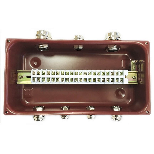 Коробка клеммная с пластмассовыми сальниками, климатическое исполнением УХЛ 1, 5; IP54; сечение жил до: 4 кв.мм; номинальный ток: до 25A; оцинкованная сталь; напряжение переменного тока: 660 В; напряжение постоянного тока: 440 В; t-раб.-40…+60°С; параметры вводов: МG20(9-14мм) х2, МG25(13-18мм) х3, МG32(18-25мм) х2; количество зажимов 20 шт; размеры 212х358х100 мм