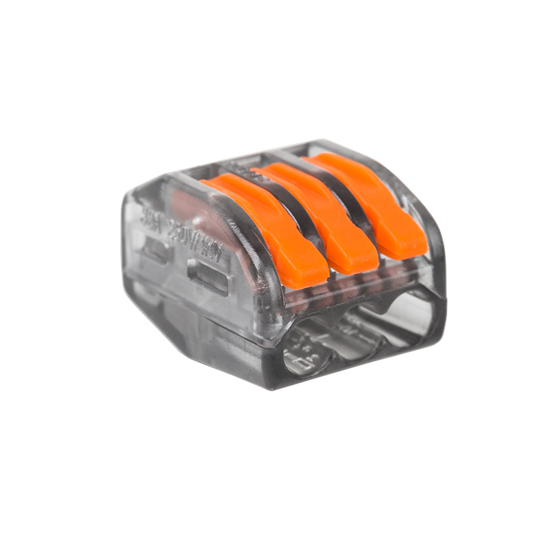 Клеммная колодка 3-х контактная прозрачного цвета с нажимным рычагом для медных одножильных и многожильных проводников сечением 3x0,08 – 4 мм2 (одножильный провод), 3x0.08-2.5 мм² (многожильный провод). Рабочее напряжение 380 В, ток 32 А. Рабочая температура: –40...+85 ºC