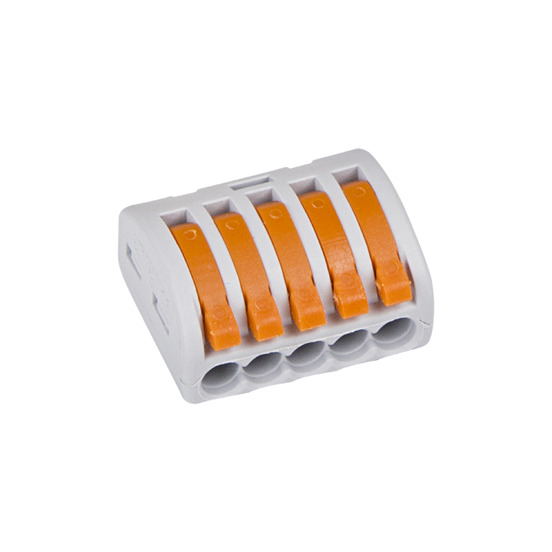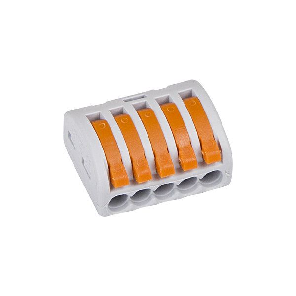 Клеммная колодка 5-ти контактная серого цвета с нажимным рычагом для медных одножильных и многожильных проводников сечением 5x0,08 – 4 мм2 (одножильный провод), 5x0.08-2.5 мм² (многожильный провод). Рабочее напряжение 380 В, ток 32 А. Рабочая температура: –40...+85 ºC