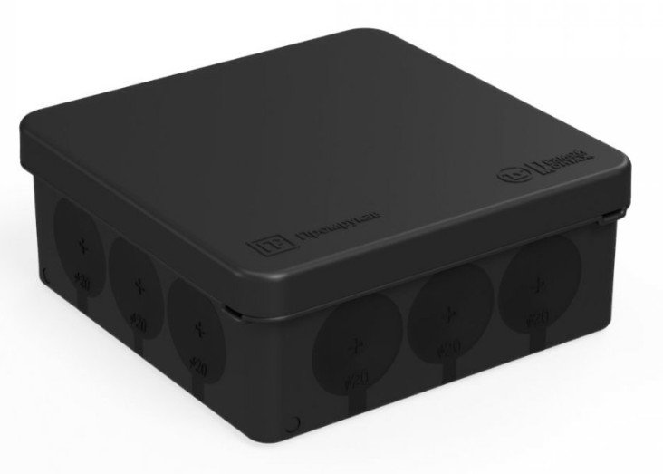 Коробка распределительная безгалогеновая (HF) для прямого монтажа двухкомпонентная (для открытой установки); 12 вводов Ø=20 мм; IP66, t-раб.-45…+60°С; 108х108х46 мм. Цвет - черный