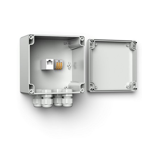 Коробка распределительная для коммутации цепей питания и линий связи. Пластик ABS. Степень защиты IP66/IP67. 4 гермоввода под кабель 6-10мм. -40°С...+70°С. 122х120х70мм