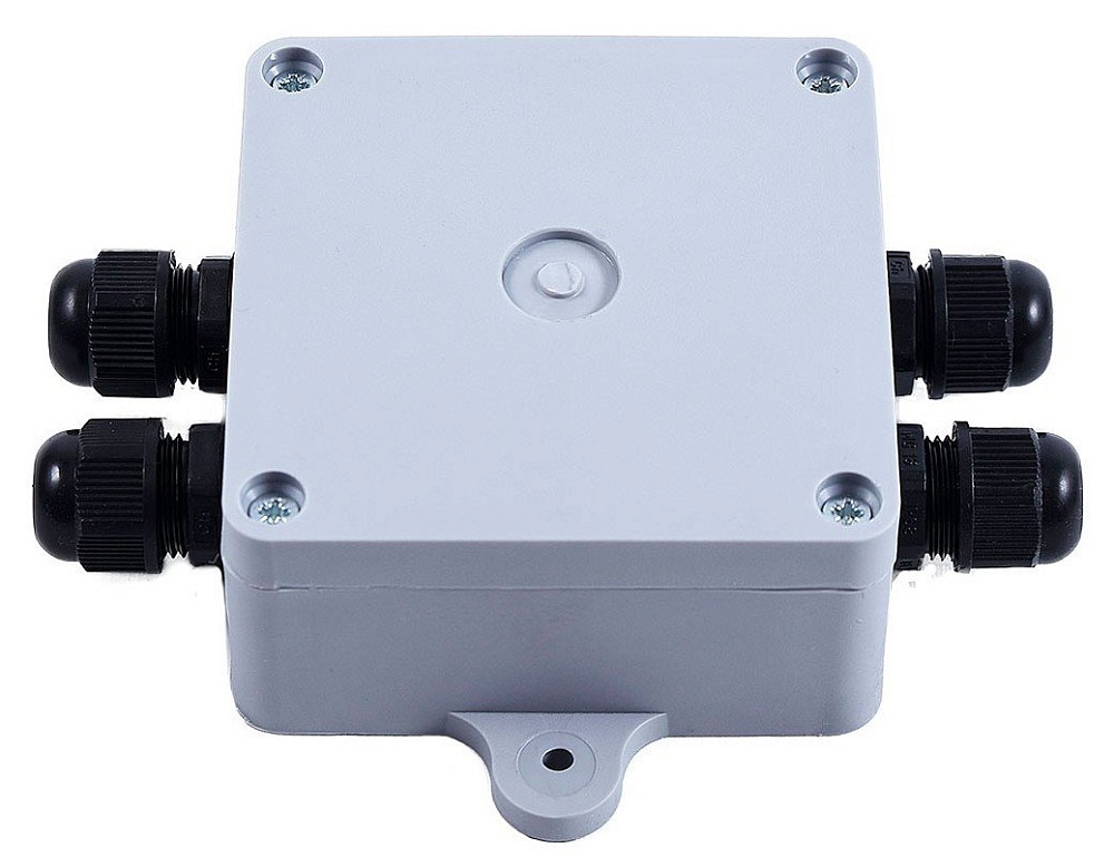Коробка коммутационная, IP67, -60°…+85°С, 4 кабельных ввода, 6-ти парная винтовая клеммная колодка, сечение подкл. проводов 0,08 – 2 кв.мм, каб. вводы ввод MG16, внутр. объем 90х90х30мм, габ.размеры без кабел. вводов 100х100х43, полиамид