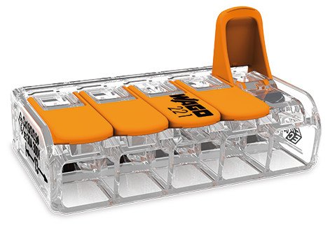 Клеммный разъем многоразовый 5-ти контактный с рычажком; прозрачный корпус; 0.5-6 мм2; 41 А; 450 В; 85°C.