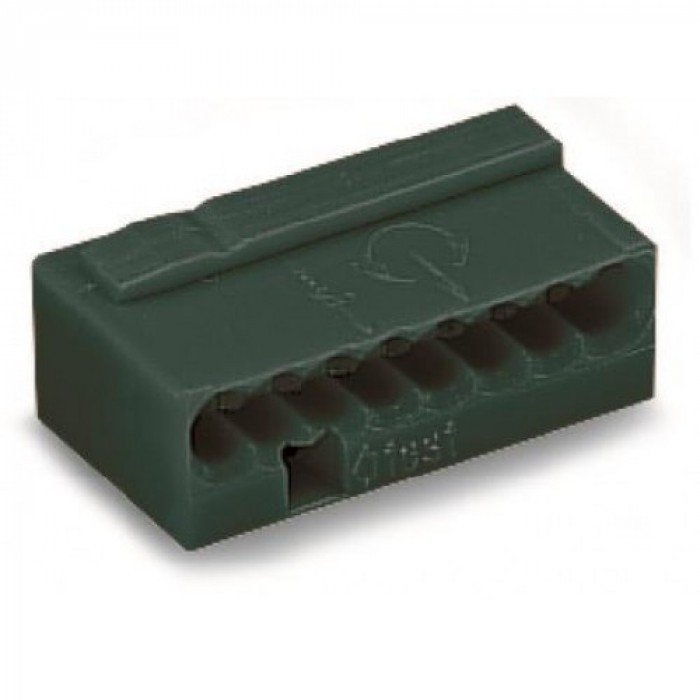 Клемма для распределительных коробок, I-ном.6 А, U-ном.100 В, 8 контакта 0.6..0.8 кв.мм, t-раб.-60…+105°С, 5.8х10х18.4 мм, цвет темно-серая