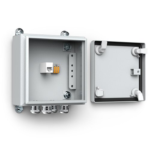 Коробка распределительная для коммутации цепей питания и линий связи. Листовая сталь. Степень защиты IP66. 4 гермоввода под кабель 6-10мм. -40°С...+70°С. 150х150х78мм