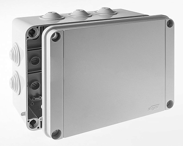Коробка ответвительная для открытой проводки с 10 кабельными вводами, 300х220х120мм, степень защиты IP55, цвет светло-серый