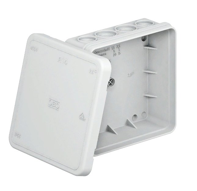 Коробка распределительная для открытой проводки с 16 кабельными вводами, 8 вводов для кабеля Ø 5-14 мм, 8 вводов для кабеля Ø 5-11 мм; защелкивающаяся крышка, IP55, габ.размеры 100х100х40 мм