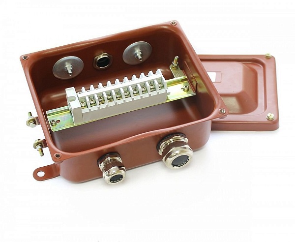 Клеммная коробка с наборными зажимами, латунными сальниками,; сечение жил до 4 кв.мм; Количество зажимов: 10 шт; Номинальный ток до 25A; Материал изготовления: оцинкованная сталь; Покрытие: грунтовое; Напряжение переменного тока: 660 В; Напряжение постоянного тока: 440 В; Климатическое исполнение: У 2; t-раб.-40…+60°С; IP54; Тип вводов: Ввод-пирамидка PVC; Параметры вводов: М25 (8-16мм) х2, М32 (14-25мм) х1; Заглушка: 2 шт; размеры 212х238х100 мм