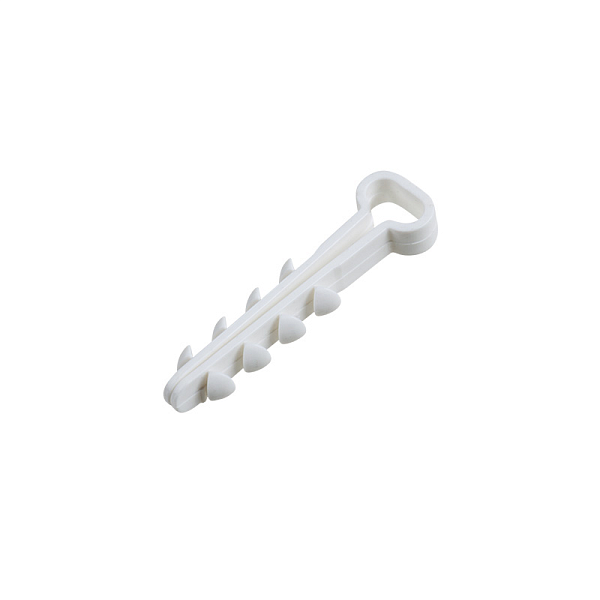 Дюбель-хомут нейлоновый; под кабель 2х0.5, 2х0.75, 2х1.5, диаметр отверстия для дюбеля 8х5мм; 41х11мм (ДхШ). Белого цвета.