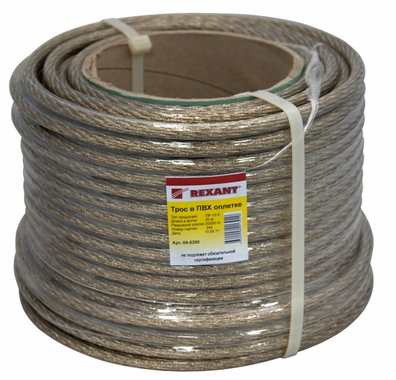 Трос металлополимерный, покрытый пластикатом ПВХ прозрачного цвета устойчивым к агрессивным средам и солнечному излучению; диаметр троса без покрытия 9мм, с покрытием 10мм; t-раб.-40...+50°C. Бухта 50 м