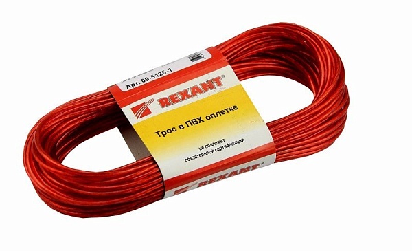 Трос металлополимерный, покрытый пластикатом ПВХ красного цвета устойчивым к агрессивным средам и солнечному излучению; диаметр троса без покрытия 1.6мм, с покрытием 2.5мм; t-раб.-40...+50°C. Бухта 20 м