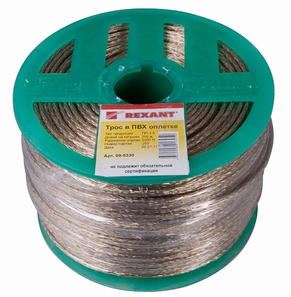 Трос металлополимерный, покрытый пластикатом ПВХ прозрачного цвета устойчивым к агрессивным средам и солнечному излучению; диаметр троса без покрытия 2.1мм, с покрытием 3мм; t-раб.-40...+50°C. Бухта 200 м